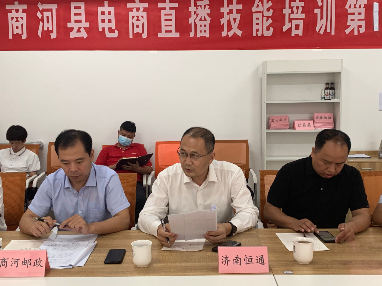 邮政商河分公司负责人介绍了邮政站点建设运营情况:打通快递进村的“最后一公里”配送问题,努力为农民群众提供更多便利,下一步与电商示范县进一步推进合作,推进邮快合作,助力电商发展发挥国企担当。