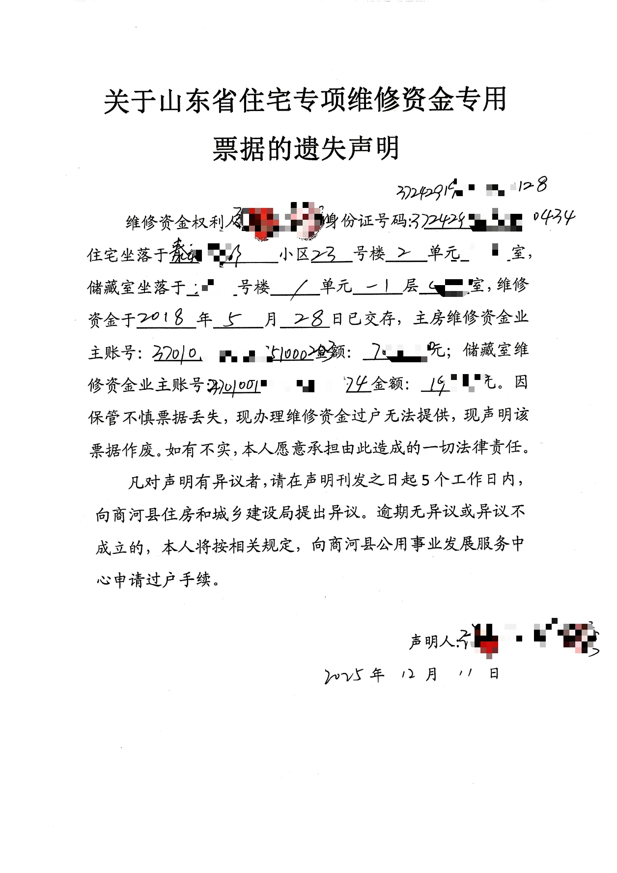 关于山东省住宅专项维修资金专用票据的遗失声明