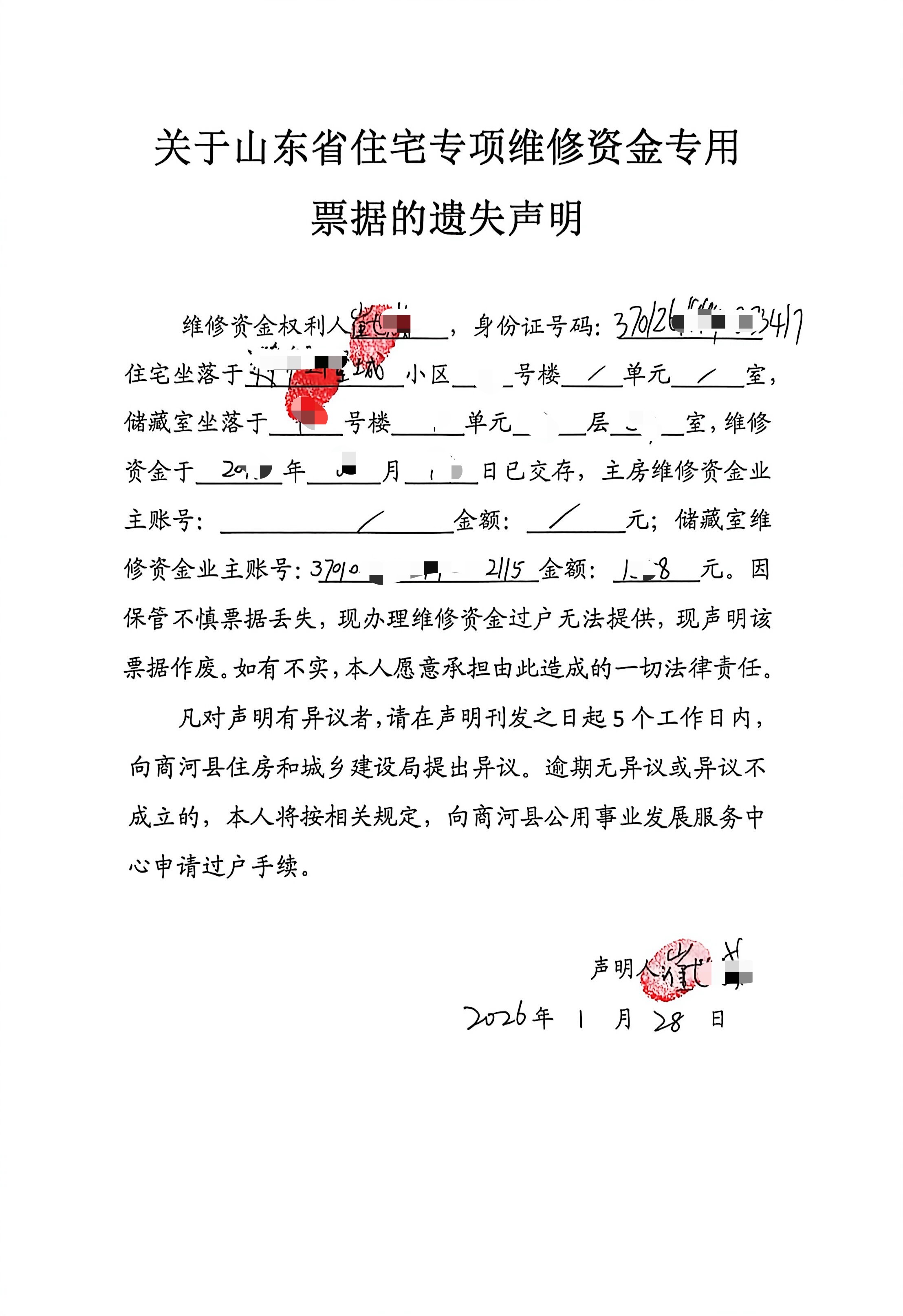 关于山东省住宅专项维修资金专用票据的遗失声明