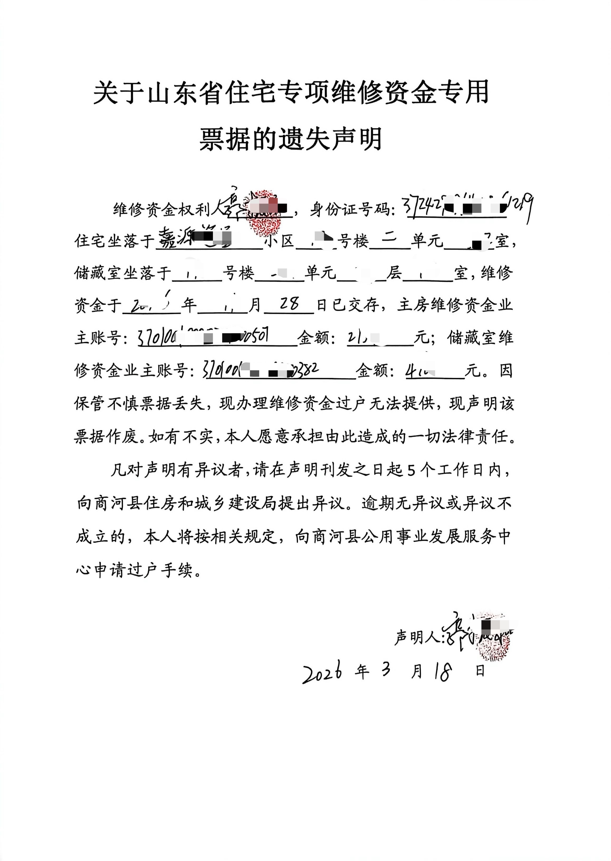 关于山东省住宅专项维修资金专用票据的遗失声明
