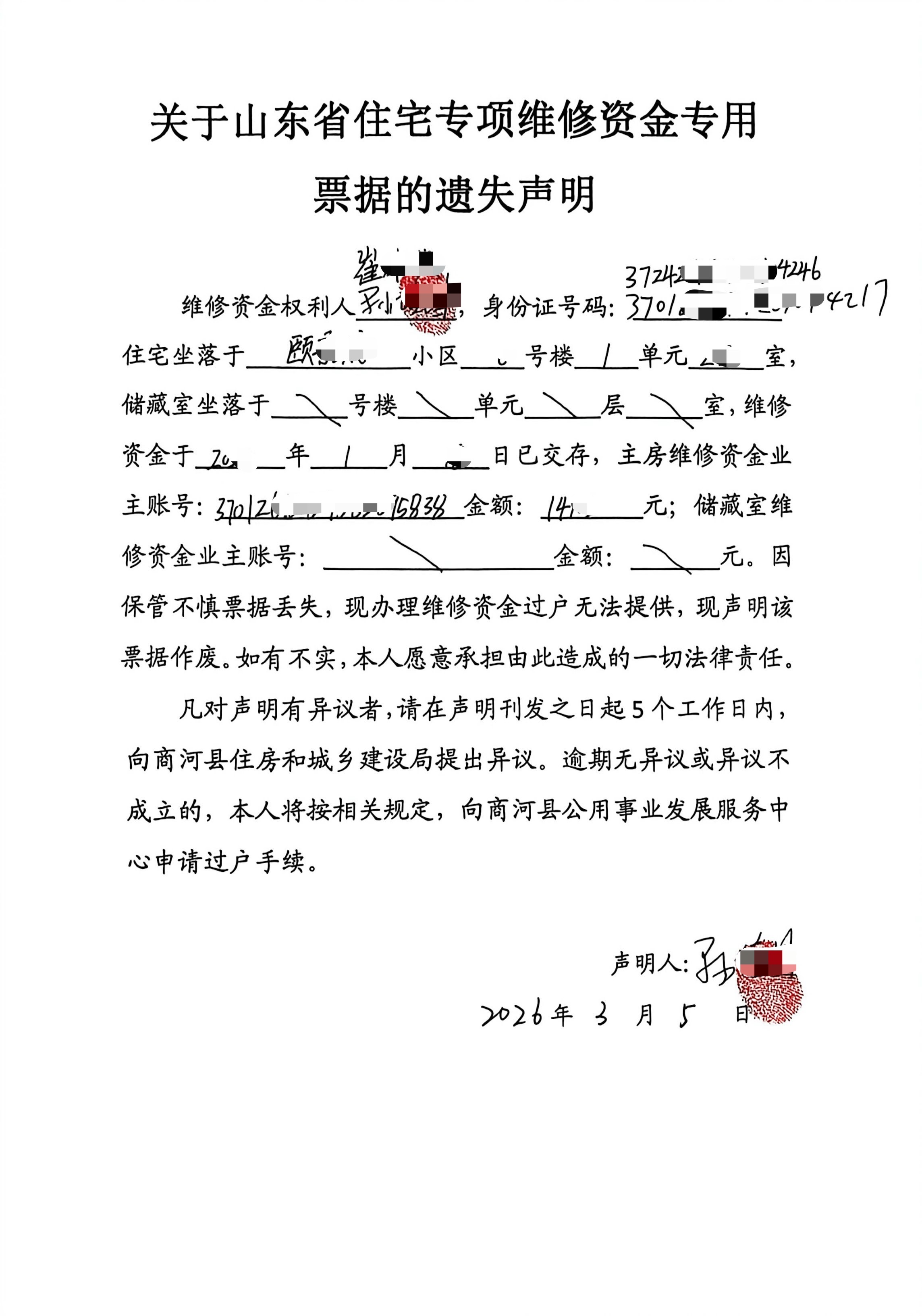关于山东省住宅专项维修资金专用票据的遗失声明