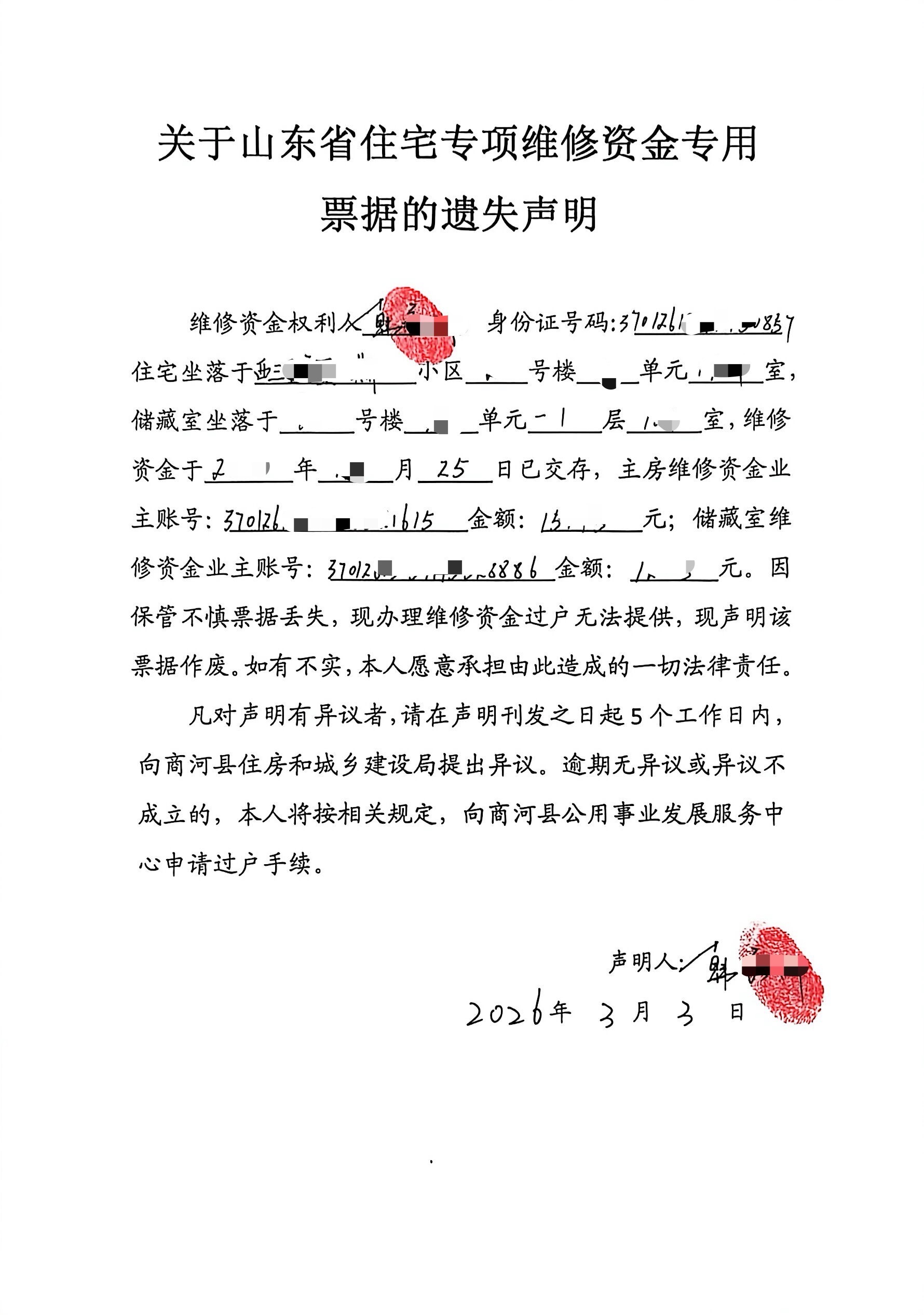 关于山东省住宅专项维修资金专用票据的遗失声明