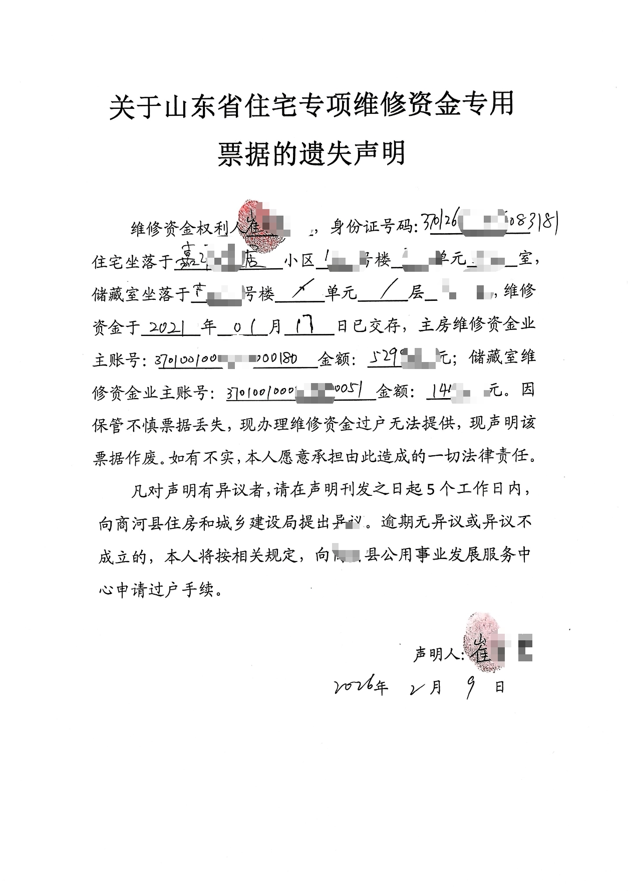 关于山东省住宅专项维修资金专用票据的遗失声明