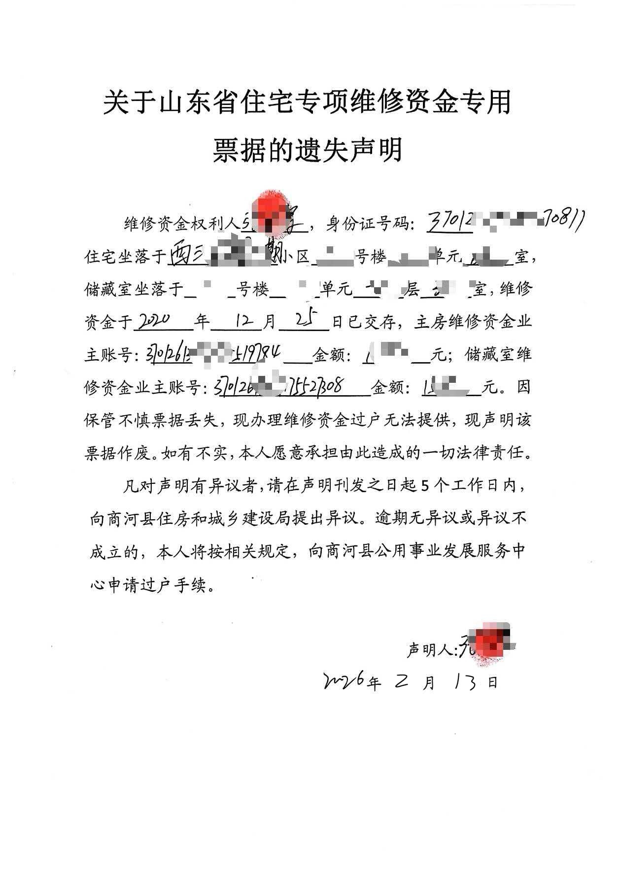 关于山东省住宅专项维修资金专用票据的遗失声明