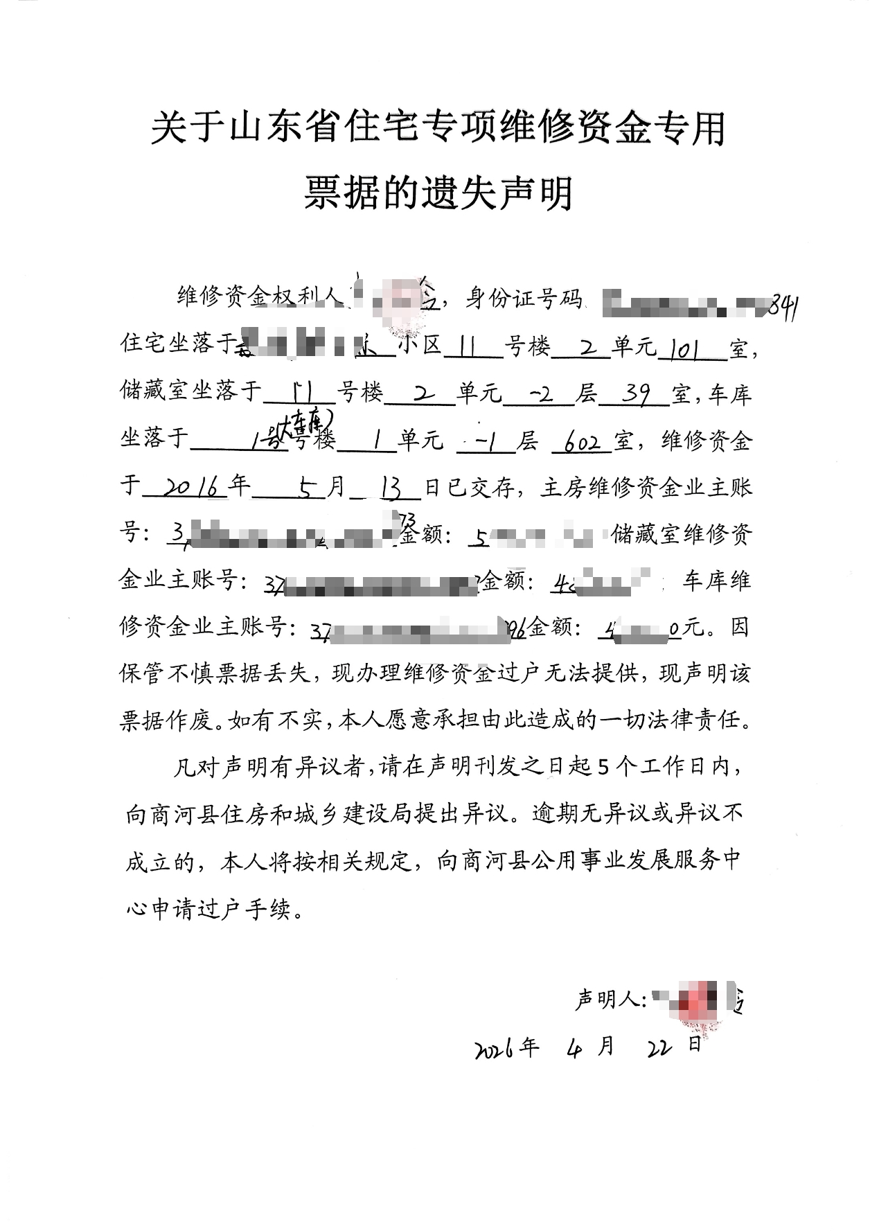 关于山东省住宅专项维修资金专用票据的遗失声明