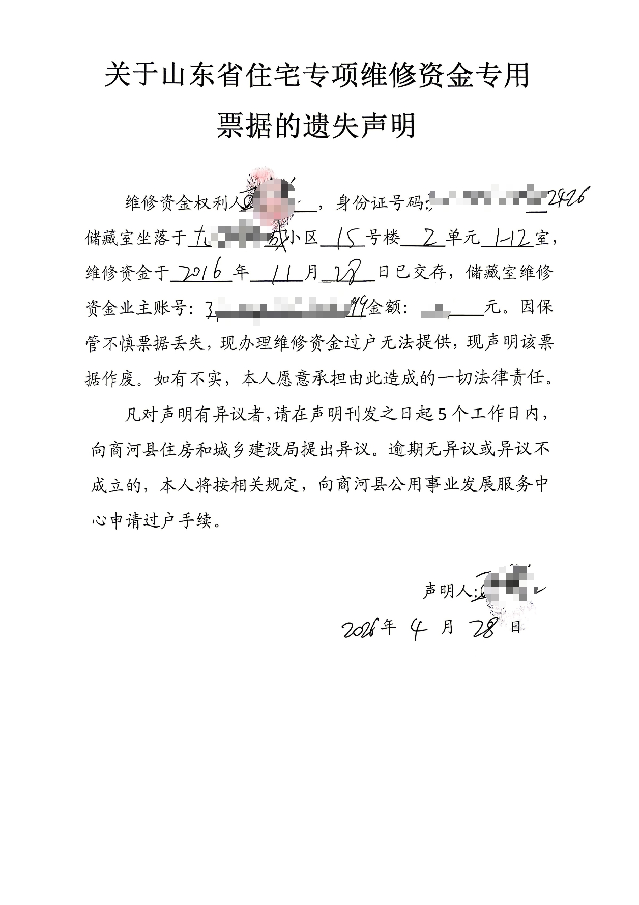 关于山东省住宅专项维修资金专用票据的遗失声明