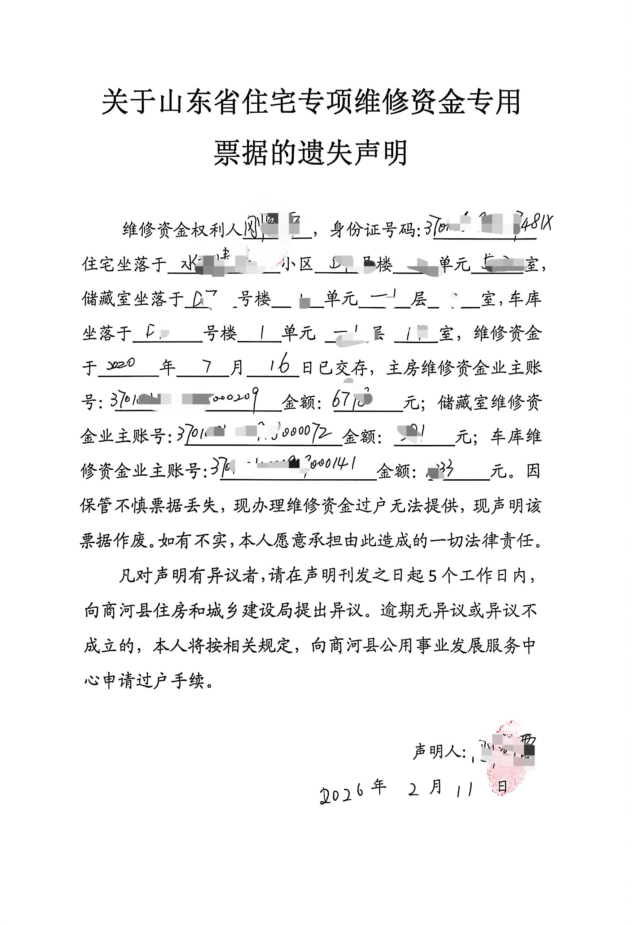 关于山东省住宅专项维修资金专用票据的遗失声明