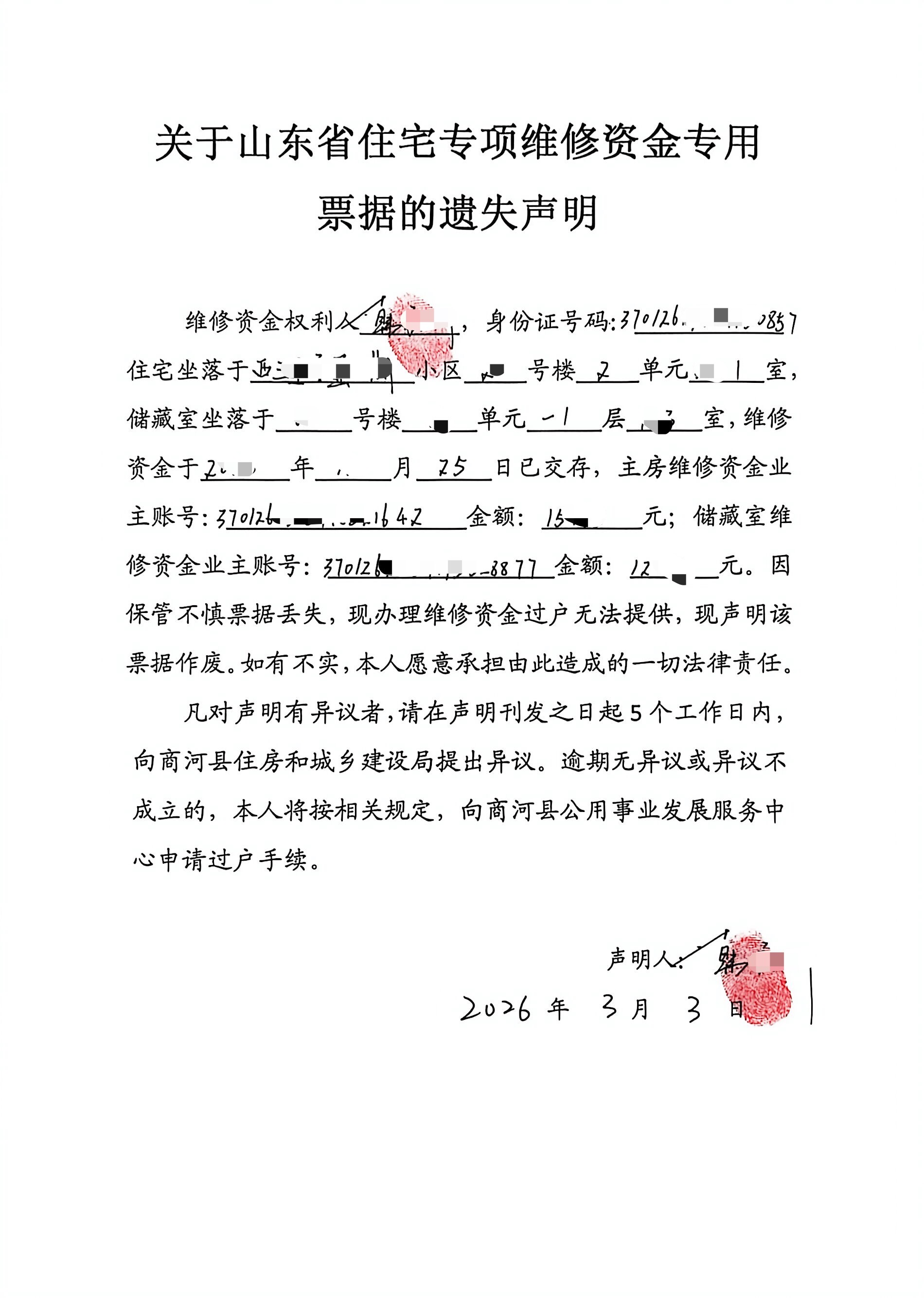 关于山东省住宅专项维修资金专用票据的遗失声明