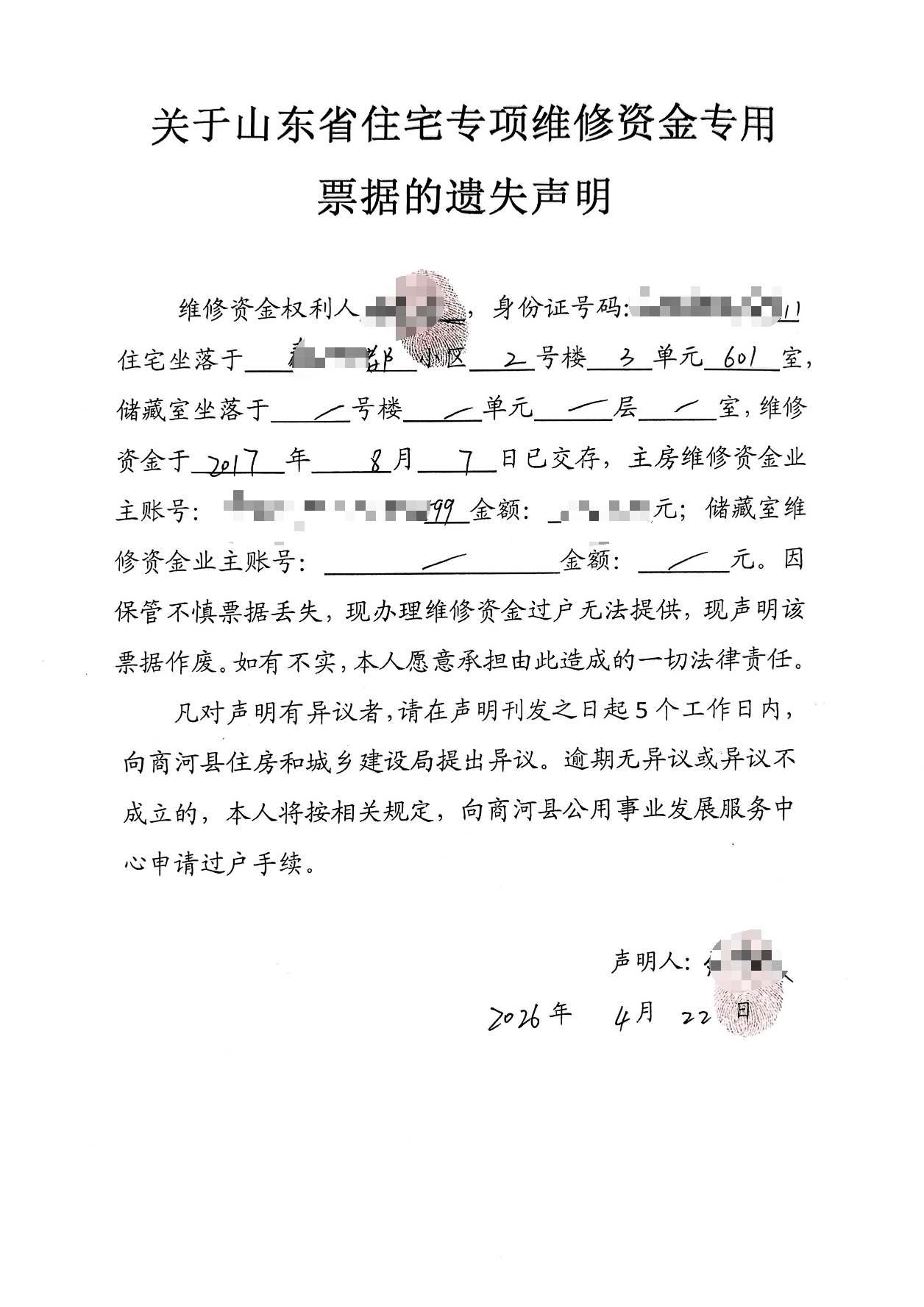 关于山东省住宅专项维修资金专用票据的遗失声明