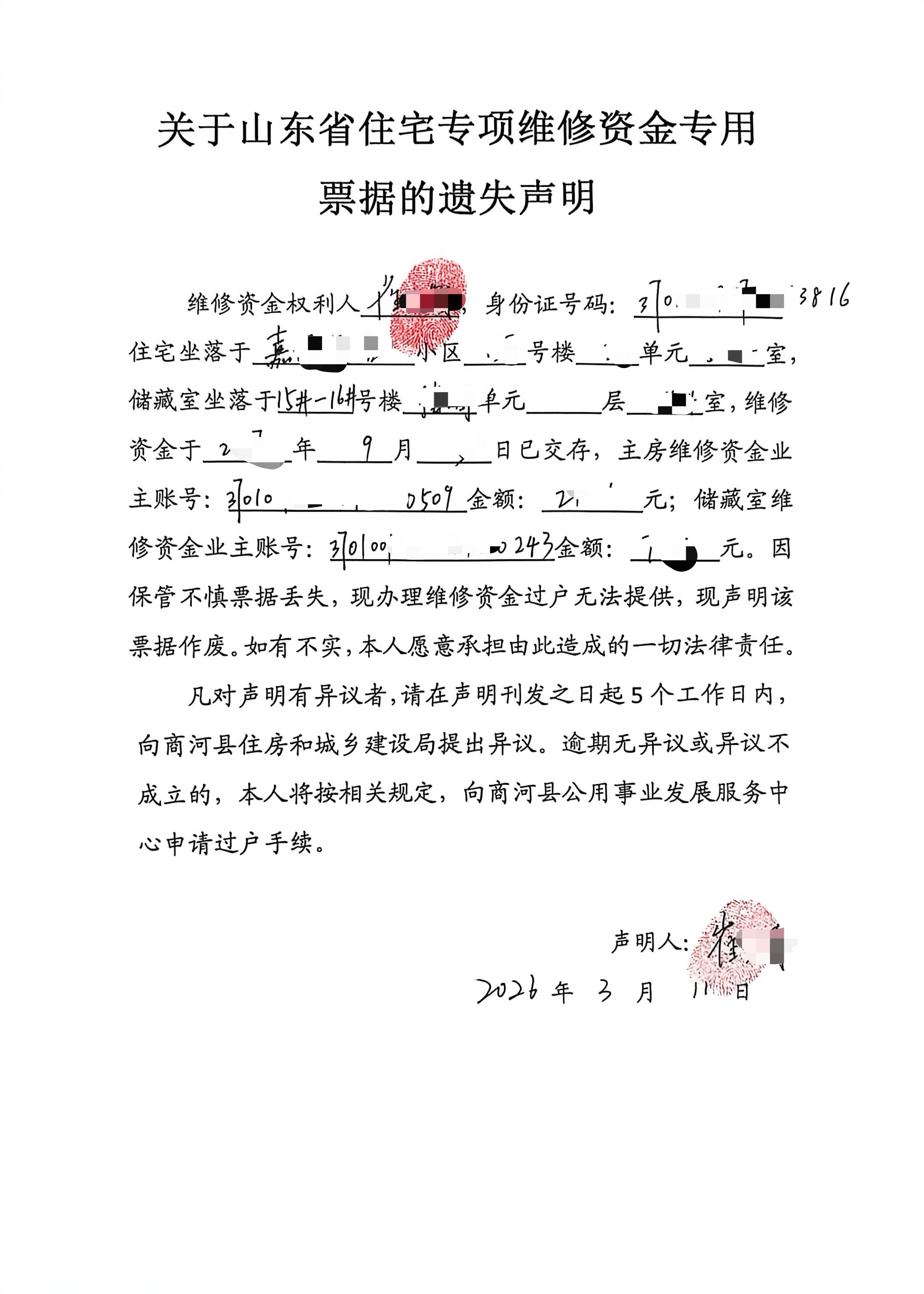 关于山东省住宅专项维修资金专用票据的遗失声明
