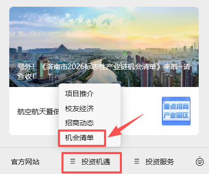 接下来,我们将按产业链每天发布更新。发布完成后,您可通过“投资济南”公众号菜单栏点击【投资机遇】→【机会清单】查阅;