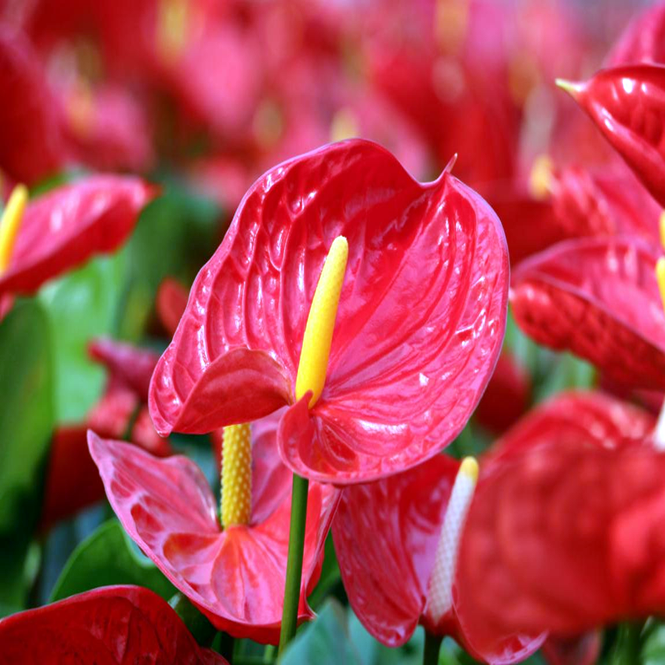红掌色泽鲜艳华丽,花语为大展宏图、前程似锦、热情如火,充满着对生活的向往,送人寓意祝福对方前程似锦,因此倍受喜爱。