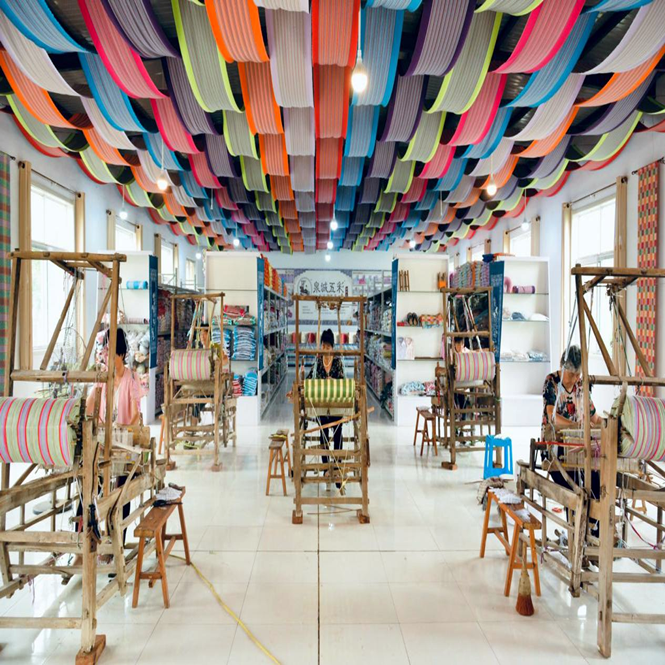 老粗布的生产工艺看上去颇为原始,甚至有些简陋,但是制作步骤却极为严密精细,经过加工棉絮、纺线、绕线、牵机、递缯、橦杼、织机等几十道工序才能织出图案精美、色彩鲜艳的老粗布。一般以红黄蓝绿棕为纬线,以素色为经线,鲜明热烈的造型给人以强烈的视觉冲击,织出来的土布不仅密度小、手感柔软,还具有图案古朴、纹理粗犷、色泽明快的特点,就像一下子回到了阔别多年的故乡。老粗布经历的数千年历史的遗传和文化的积淀,给人一种发自心底的认同感。