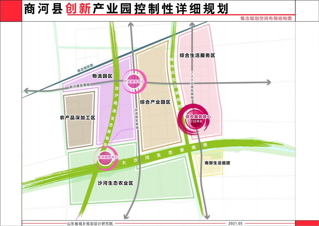 产业园利用德龙烟铁路、京沪高速公铁联运优势,以及商河县创新引领、城乡融合、三产共进的高质量发展优势,按照“融区域、转动能、补短板、优结构”的思路,规划形成以金沙河面业为依托的食品加工产业链建设创新产业园,以及保税物流园区、冷链物流与分散货物物流仓储区,全力打造现代商贸物流和装备制造业为主的综合性园区,建设济南市重要的创新产业基地,鲁北地区公铁联运、陆海联动的新枢纽、济南市新旧动能转换产业承载的新基地、 商河县创新引领、城乡融合、三产共进的高质量发展的新园区。
